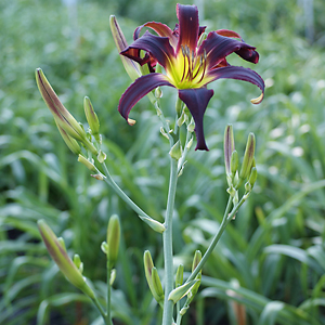 SKY LAB (Jane Trimmer) Tetraploid ((Rolling Raven X (Sdlg x Royal Celebration) 50" EM Ev. 9" My son Steven made a beautiful electronic song named SKYLAB and this flower shares the names of his song. I have an affinity for space names because a close friend Bill Vojir, a brilliant Northrup Grumman, rocket scientist has been a part of my life since I was four years old! Bill was part of the team that landed the LEM on the moon.Our family laments the closing of the space shuttle program. SKYLAB is a very tall and graceful black, purple with a large green, yellow eye pattern and a green heart. It is fertile and again I am not positive about rebloom due to our irrigation problems this spring. It has 22 buds and 2 laterals.