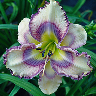 TRACES OF TIME (D. Trimmer) Tetraploid 29” 7 1/2” EM. Re. Ev. (Waves Of Joy X Sailing) Two of my goals from the first seedling crop of patterned seedlings until the present has been to have cleaner base colors, and larger, rounder blooms. SAILING can exceed nine inches and is a clean cream, so when crossed onto the lavender WAVES OF JOY the only seedlings from this cross were all pale in color, larger and flater with the added bonus of double edges. TRACES OF TIME is by far the fastest to increase and was used extensively as a pollen parent. The large ivory blooms with blue etched violet eye and edge produced a few pods, but again heat was a problem, but day after day the blooms were stunning. Typical bud count of 24-25 is typical on three lateral branches. |