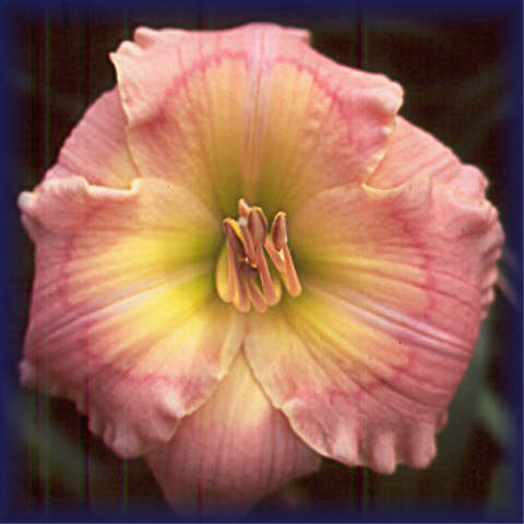 (Dan Trimmer, 1999). Tet (Janet Gordon X Summer Blush) Dormant 4 !/2 EM Re 26 I’ve had limited success in trying to breed for complex eyes in the lavender and purple areas, but have had success with these types of eyes in red. TENNYSON is very fertile and produces an extremely high percentage of keepers. The red eye etch is dominant as is the very large yellow green throat. TENNYSON’S blooms are round, full and ruffled. Very dormant, I’m surprised that TENNYSON performs equally well north and south, increasing rapidly even when abused by a hybridizer setting too many pods. Bud count is 25, foliage is low and broad. From a distance the overall effect of TENNYSON is a clean green pink. |